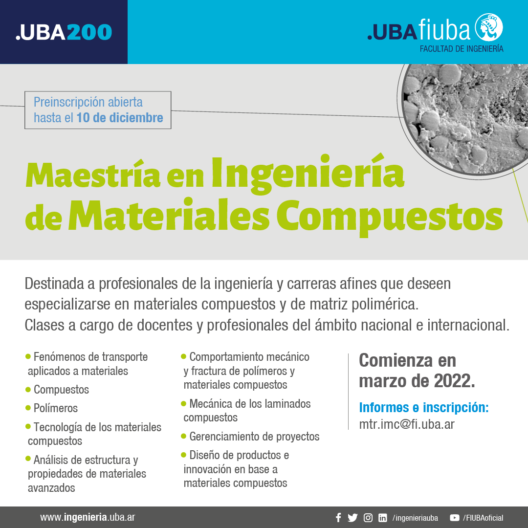 La Maestría en Ingeniería de Materiales Compuestos (MIMC) tiene la finalidad de conglomerar a expertos de la industria y científicos del área de materiales compuestos bajo el lema de difusión y transferencia de conocimiento adquirido. La Maestría constará con la participación de docentes y profesionales del ámbito nacional e internacional. Está orientada a profesionales que actualmente trabajan en el área de ingenierías y que deseen especializarse en materiales compuestos de matriz polimérica.